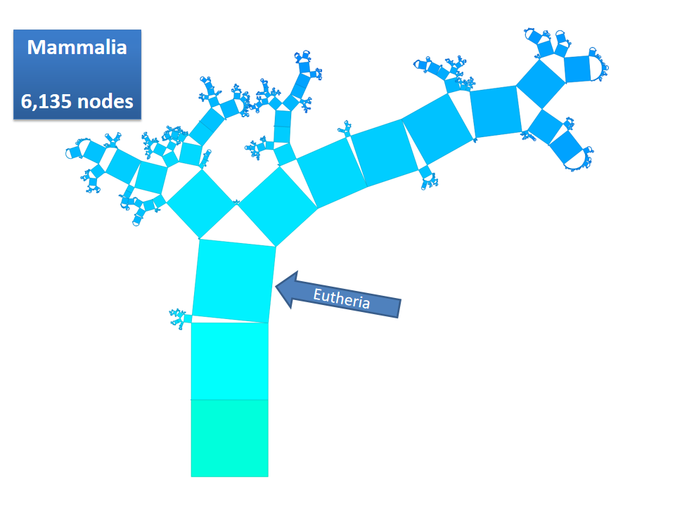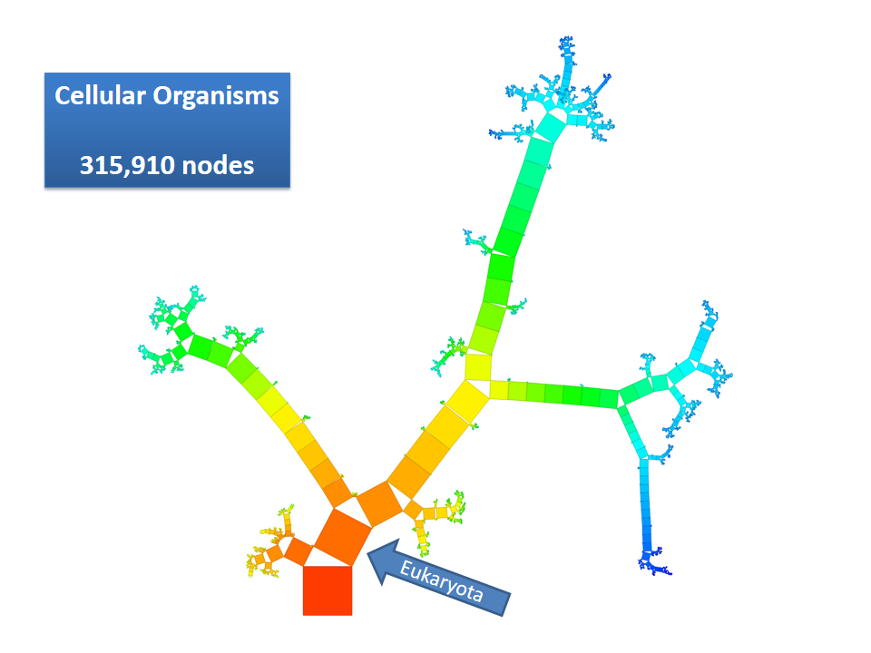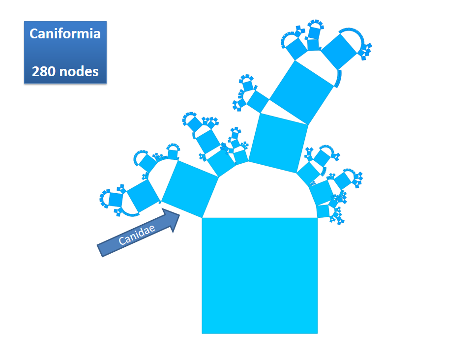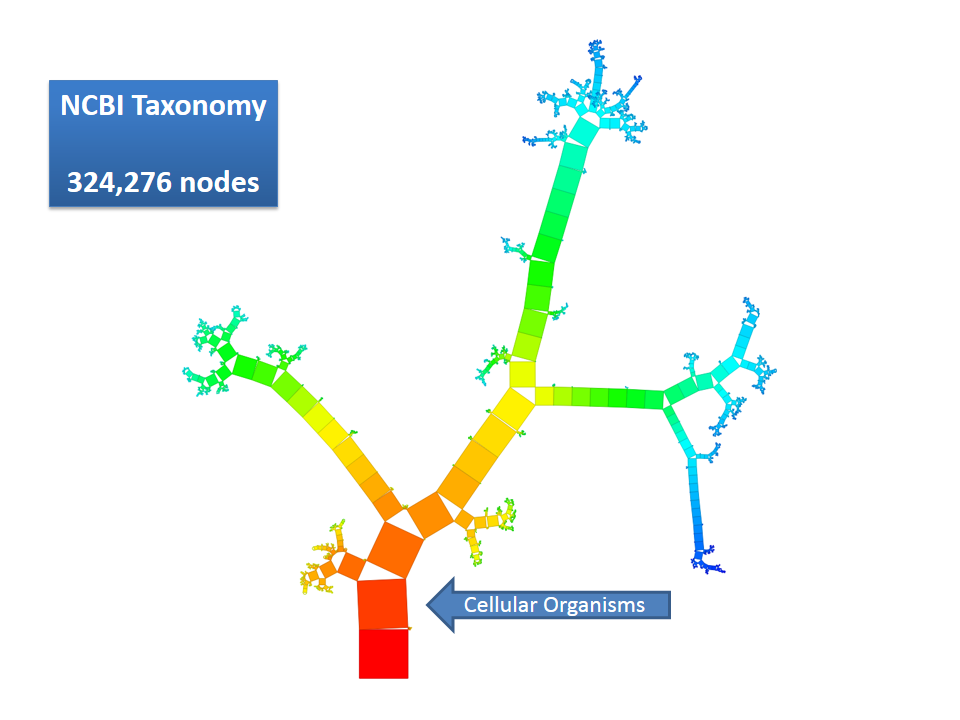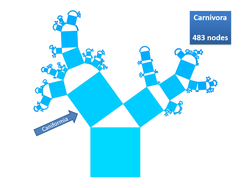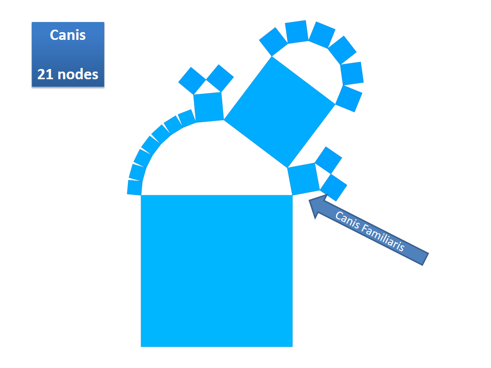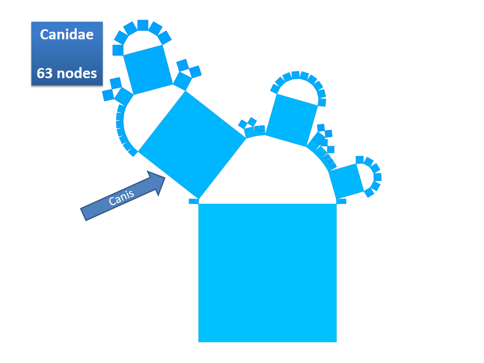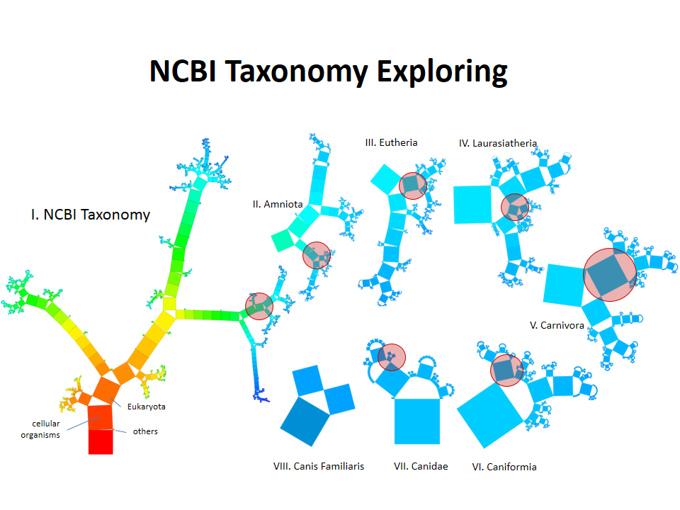This example shows Generalized Pythagoras Trees applied to the NCBI tree of life. It contains 263,691 organisms classified into 60,585 groups of species (in total: 324,276 nodes). By clicking through the gallery you browse the tree down to a well-known animal: the common dog, Canis Familiaris.