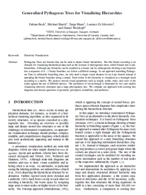 Fabian Beck, Michael Burch, Tanja Munz, Lorenzo Di Silvestro, and Daniel Weiskopf. Generalized Pythagoras Trees for Visualizing Hierarchies. In IVAPP '14 Proceedings of the 5th International Conference on Information Visualization Theory and Applications. 2014 (to appear).